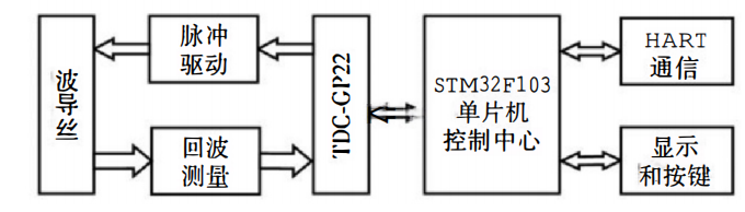 系统硬件框图如图1所示。本设计以STM32-F103RBT6单片机为控制核心,使用MS1022芯片测量发射脉冲与回波的时间差。MS1022芯片中Fire管脚控制脉冲驱动电路发射激励脉冲。波导丝在激励脉冲和磁性浮子相互作用下产生一个扭应力波,被回波测量电路检测到,然后送回到MS1022芯片中Stop管脚。经过MS1022芯片计算出时间差,再由单片机计算出对应的位移高度。同时,根据位移高度输出4~20mA电流信号。利用液晶屏和按键可以对仪表的参数进行修改和调整。