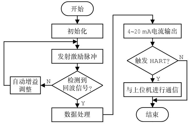 系统开始工作时,初始化过程中对MS1022芯片进行配置,MS1022接收到测量指令后发出脉冲信号,经过高压脉冲驱动电路形成高压激励脉冲,驱动磁致伸缩传感器工作。回波检测电路收到回波信号后经过滤波和放大输入到MS1022芯片。MS1022芯片计算出发射和接收之间的时间差传输给单品机,单片机STM32F103RBT6进行数据处理后计算位移高度,并输出与位移对应的电流值。系统流程图如图5所示。
