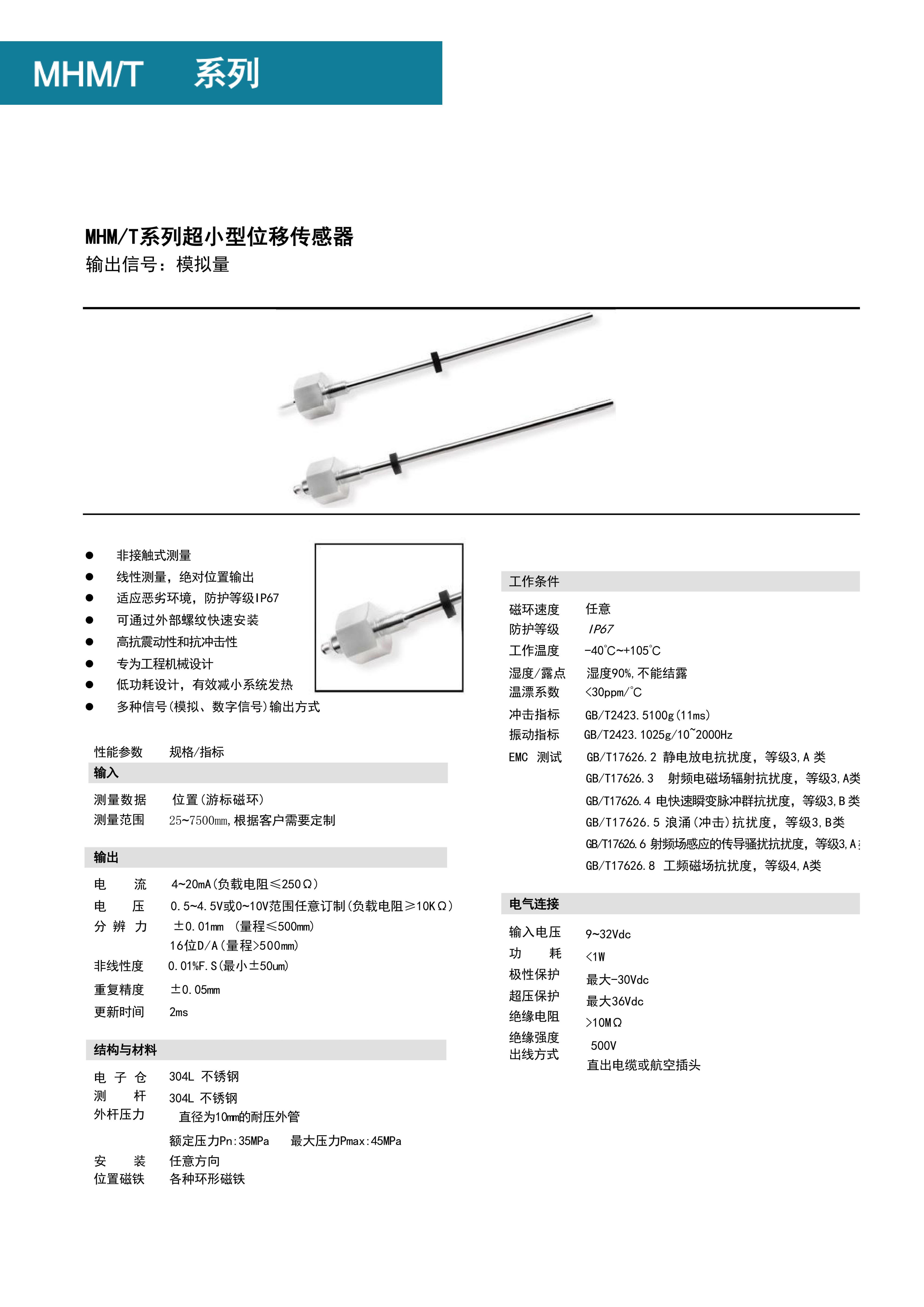 博尔森MHM/MHT系列是专为液压油缸内置行程测量设计的螺纹式模拟量磁致伸缩位移传感器,带M18x1.5螺纹,耐压外管可选7mm/10mm,测量行程达7500mm。